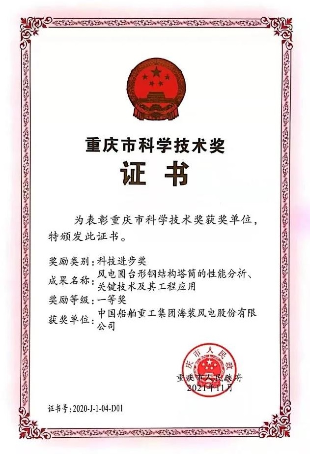 中国船舶集团旗下中国海装申报的两项成果《高效安全大型风电机组传动链关键技术与应用》《风电圆台形钢结构塔筒的性能分析、关键技术及其工程应用》荣获重庆市科技进步奖一等奖。