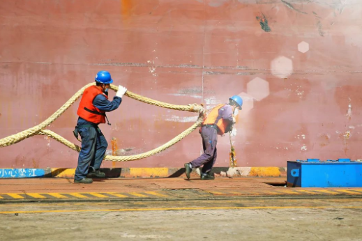 下午骄阳似火,修船码头带缆工人正在给刚刚靠泊的船舶带缆绳。