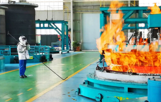 重齿公司热处理车间,热处理工人面对着高达800多度的热处理炉,不惧高温火焰,确保产品高质量产出。