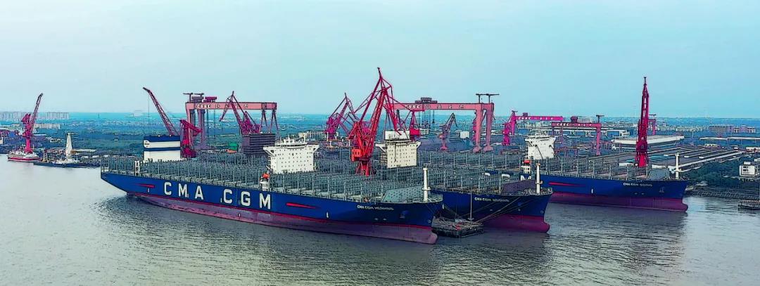 “海上绿巨人”系列箱船是沪东中华近期的重点产品。三艘15000TEU集装箱船列队整齐,沪东中华建造团队开足马力,奋战金秋。该型号集装箱船是当今世界绿色环保船型,国产化率达到90%,可灵活布置于全球各个重要航线。