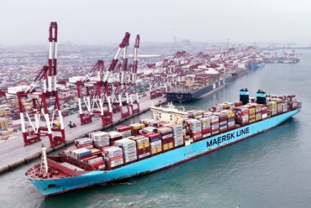 ▲在山东港口青岛港前湾码头,欧洲贸易航线的“美途马士基”集装箱货轮解缆起航(2022年7月29日摄,无人机照片)。新华社记者 李紫恒 摄