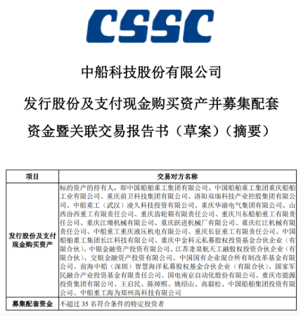 10月10日,中国船舶集团有限公司旗下上市公司中船科技股份有限公司发布《发行股份及支付现金购买资产并募集配套资金暨关联交易报告书(草案)》等公告。根据公告,中船科技拟通过发行股份及支付现金的方式购买交易对方持有的交易作价合计约为91.98亿元的标的资产,并拟非公开发行股票募集不超过30亿元的配套资金。该草案的公布标志着中船科技重大资产重组取得具有里程碑意义的重要进展。