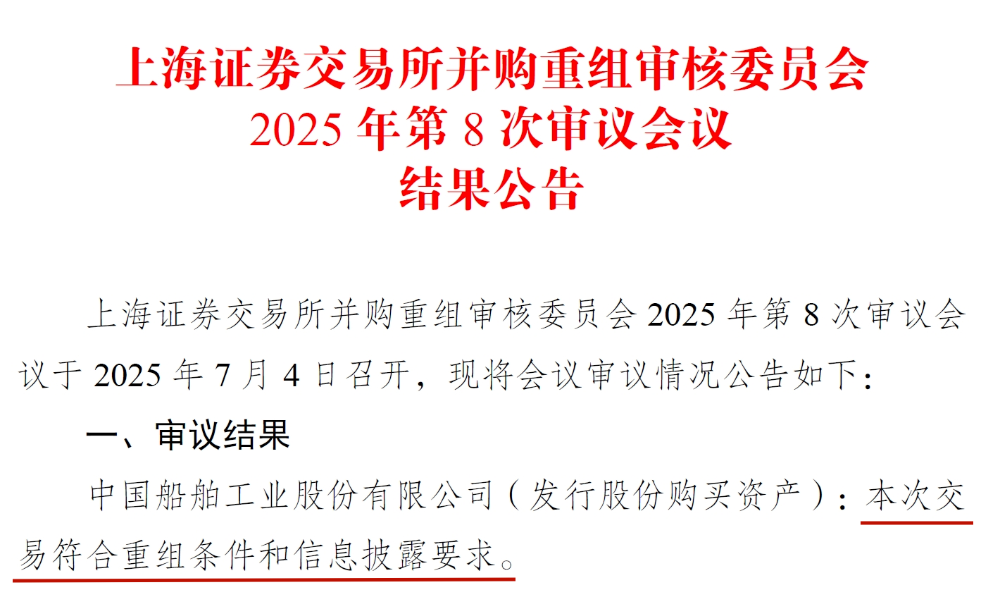 7月4日,上海证券交易所并购重组审核委员会2025年第8次审议会议召开,审议结果为中国船舶工业股份有限公司(发行股份购买资产):本次交易符合重组条件和信息披露要求。