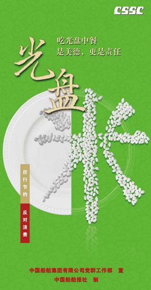 为大力弘扬勤俭节约、珍惜粮食的文明用餐习惯,中国船舶集团近日印发了《组织开展“制止餐饮浪费 践行光盘行动”专项宣传引导活动方案》。《方案》提出,要以引导广大职工养成勤俭节约习惯为目标,以单位食堂、家庭为重点,通过在集团公司持续开展专项宣传引导活动,全面倡导勤俭节约、反对浪费的文明理念,着力在集团公司推动形成简约适度、绿色环保、健康文明的饮食方式,让“文明餐桌”成为广大职工的一种思想共识和自觉行动。《方案》确定了“广泛深入动员,凝聚全员共识”“紧盯重点部位,注重示范引领”“坚持依法依规,强化监管督导”“加强舆论宣传,营造浓厚氛围”等活动内容,提出了“高度重视,形成专项”“迅速行动,有序推进”“形成常态,贵在坚持”等活动要求。