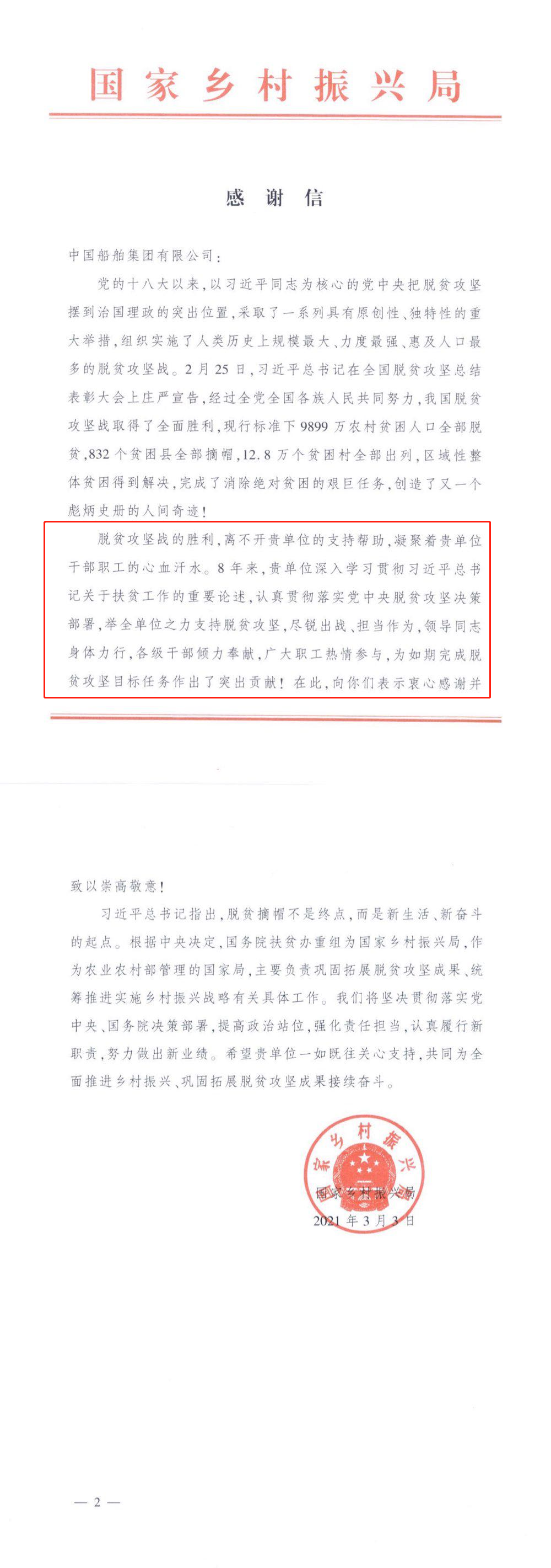 日前,中国船舶集团收到一封特殊的感谢信。信中对中国船舶集团8年来的担当作为、倾情奉献表示感谢和敬意,这封信来自不久前刚刚挂牌的国家乡村振兴局。