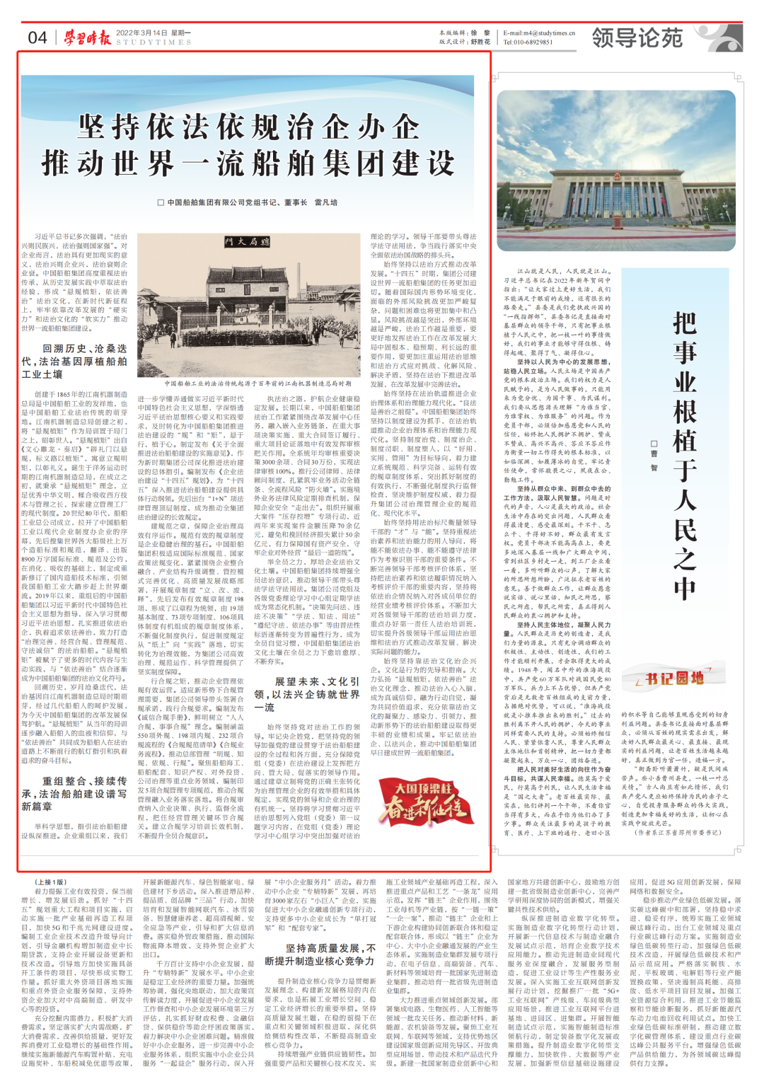 3月14日,《学习时报》刊发中国船舶集团有限公司党组书记、董事长雷凡培的署名文章《坚持依法依规治企办企 推动世界一流船舶集团建设》,全文如下: