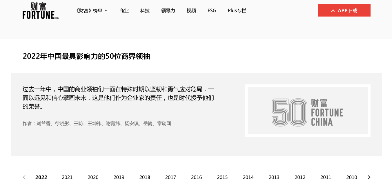 截图来自《财富》官网 据了解,《财富》于2005年开始评选“中国最具影响力的商界领袖”。 点击“阅读原文”,了解更多。 | 责 编:高红梅 | 校 对:周 芒 | 审 核:项 丽/甘丰录