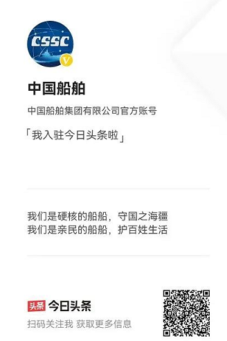 继中国船舶官方抖音号之后,中国船舶官方头条号今天也正式开通!