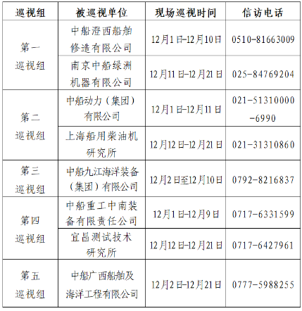 根据中国船舶集团党组2022年第二轮巡视工作部署,截至2022年12月2日,中国船舶集团党组5个巡视组已进驻中船澄西船舶修造有限公司、中船动力(集团)有限公司、中船九江海洋装备(集团)有限公司、中船重工中南装备有限责任公司、中船广西船舶及海洋工程有限公司等单位,开展为期20天左右的巡视“回头看”。巡视期间,巡视组设置专门值班电话(具体如下表),同时在巡视组工作现场设置联系信箱,广大干部职工可以反映情况。