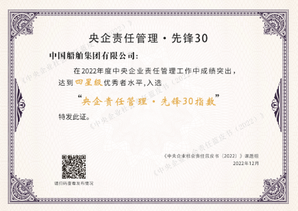 2022年12月20日,由国务院国资委社会责任局主办、中国社会责任百人论坛承办的“新征程 新责任——《中央企业社会责任蓝皮书(2022)》《国资国企社会责任蓝皮书(2022)》发布活动”在京举行。活动以“云端会议”的方式举办,发布了“央企责任管理 · 先锋30指数”,中国船舶集团入选该指数。