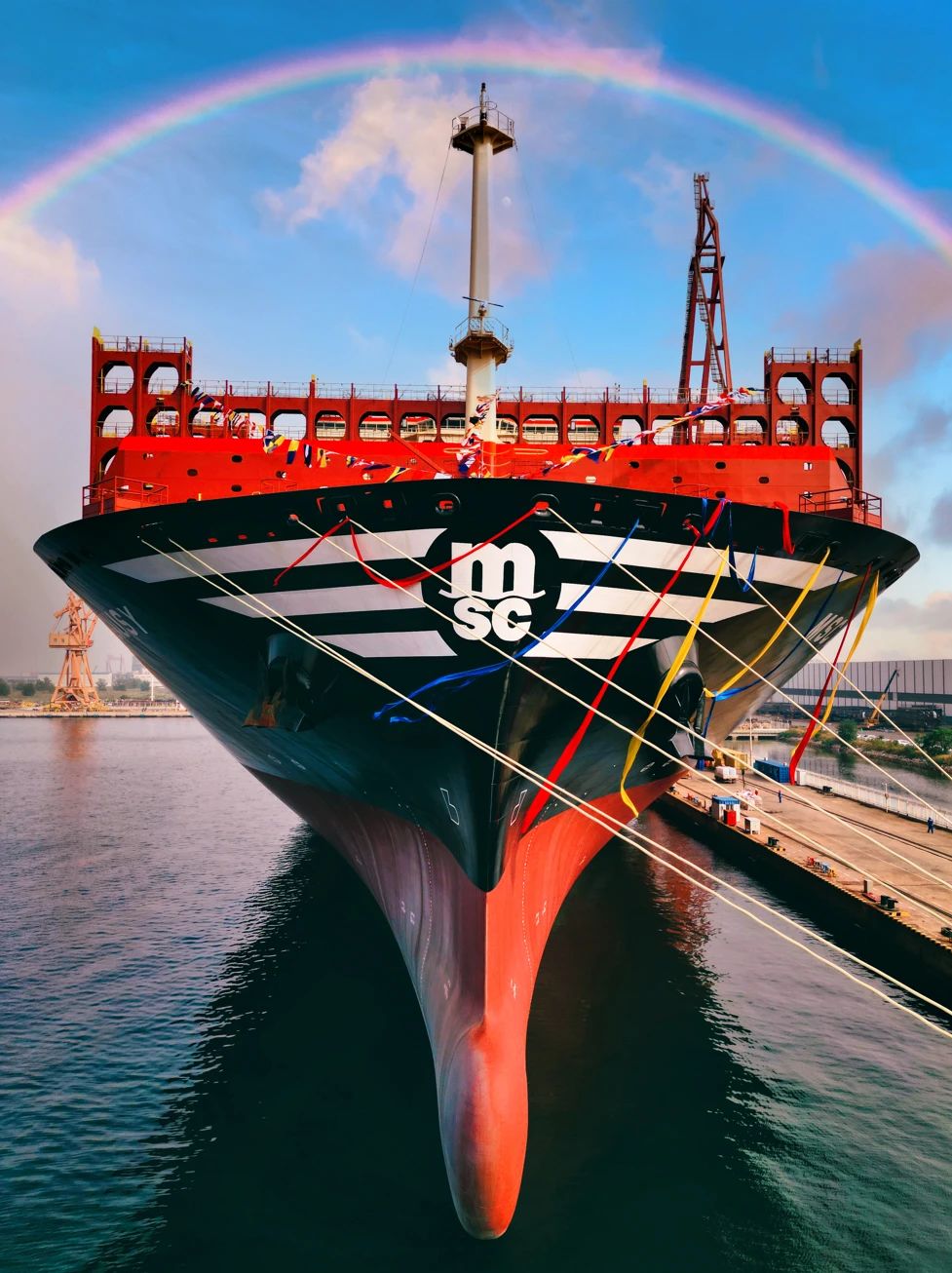 壮丽的船身如山峦一般,余晖映衬下,一位工人正驾驶高空车完成外板清洁施工,构成一幅绝美的画面。