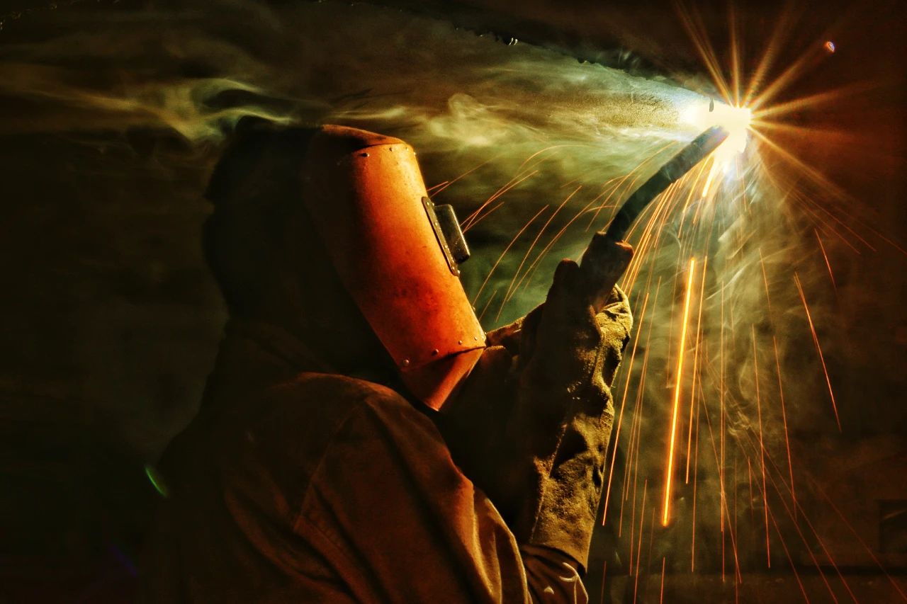 一位“全副武装”正在进行焊接作业的焊工,焊花飞舞在狭小的工间里,折射出如彩云般的景象,犹如巨人正在“补天”。
