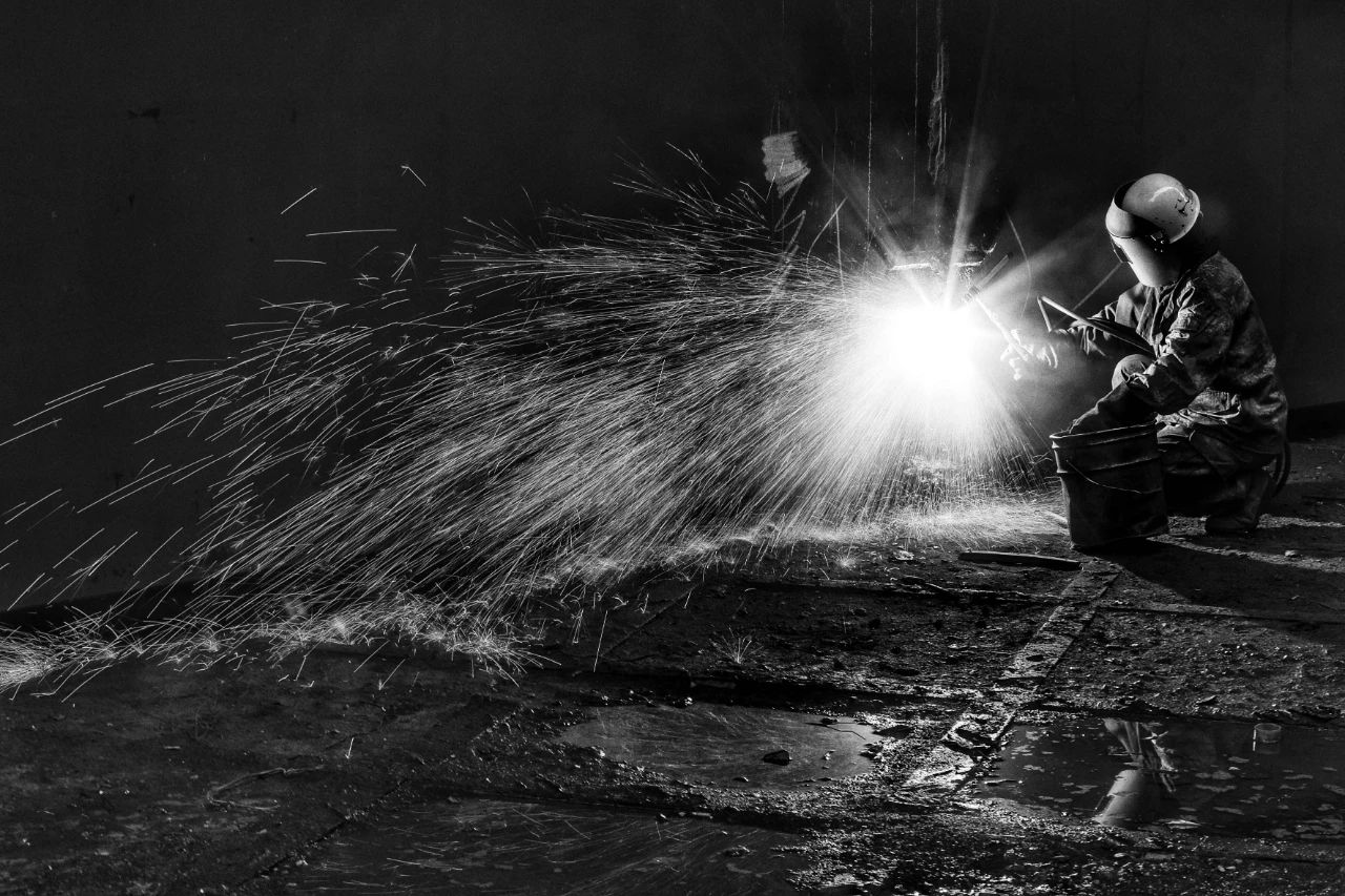 电焊工,就文冲修造最美的一线工人,他们从头到脚“全副武装”,一副墨镜,一个面罩,一套包裹的严严实实的工作服是他们的色调。此起彼伏吱吱作响的烧焊声,黄红蓝色的焊花,伴着刺眼的弧光,如喷泉一般是他们奏响的乐章。