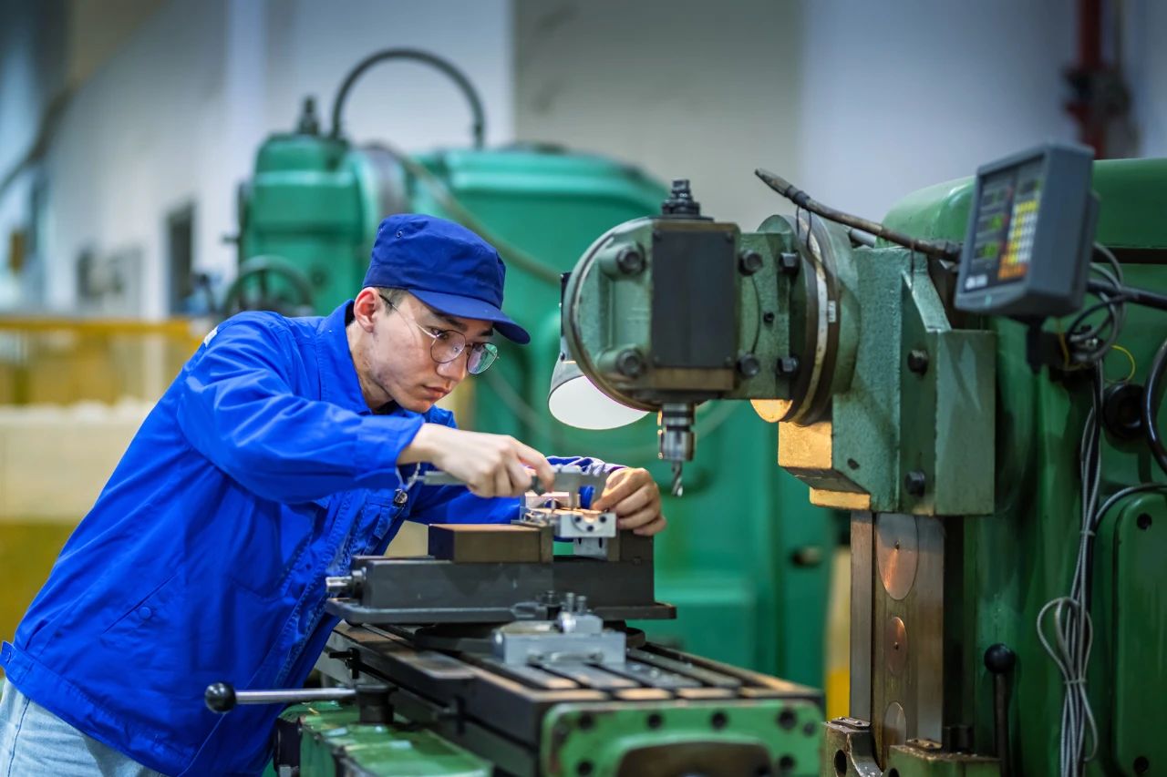 一位工人正在认真的检查组装好的齿轮箱,确保其高质量产出,驱动公司产业发展。