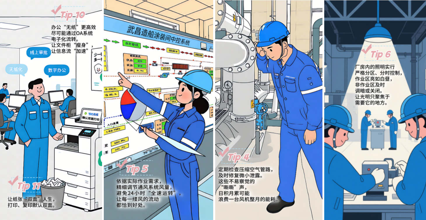 武昌造船在节能宣传周期间组织开展了“船厂节能秘籍”征集活动,以船厂员工的一天为轴线,收集到各类节能基本操作,形成了《这些基本操作,我知道你一定能做到》宣传材料,并通过公司公众号发布,向员工普及节能知识与技巧,扩大节能宣传覆盖面。同时开展 “停用空调”能源紧缺体验行动,倡议全体员工在全国低碳日,关闭办公室、会议室及非必要区域空调设备,通过实际行动感受能源紧缺,践行节能理念,进一步增强员工资源忧患意识。