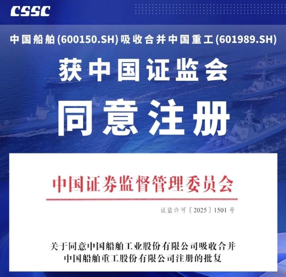 7月18日,中国证监会发布《关于同意中国船舶工业股份有限公司吸收合并中国船舶重工股份有限公司注册的批复》,同意中国船舶工业股份有限公司换股吸收合并中国船舶重工股份有限公司。