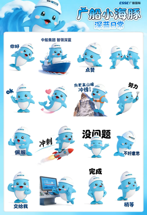 广船小海豚?深蓝日常系列表情包,以灵动可爱的小海豚为核心形象,融入广船“深蓝”底色与造船人的初心情怀,捕捉船厂工作与日常沟通的暖心瞬间。