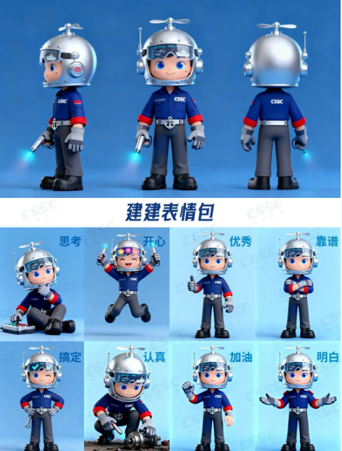 建建(造船担当)以银色防护头盔(嵌船舶零件电子屏、印舰船剪影)、船锚腰带、CSSC工装及焊枪,凸显造船匠心精神;航航(航行担当)凭船舵头饰、导航罗盘、海鸥披风与船锚上衣,传递中船航行使命。二者以 “建造 - 航行” 闭环,具象中船全链条实力,彰显中船文化。