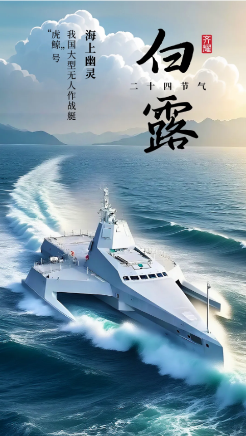 该海报以即梦AI为笔,绘就了一场跨越时空的对话,将“白露”的清冷赋予“海上幽灵”无人艇的锋芒。