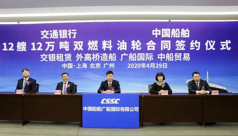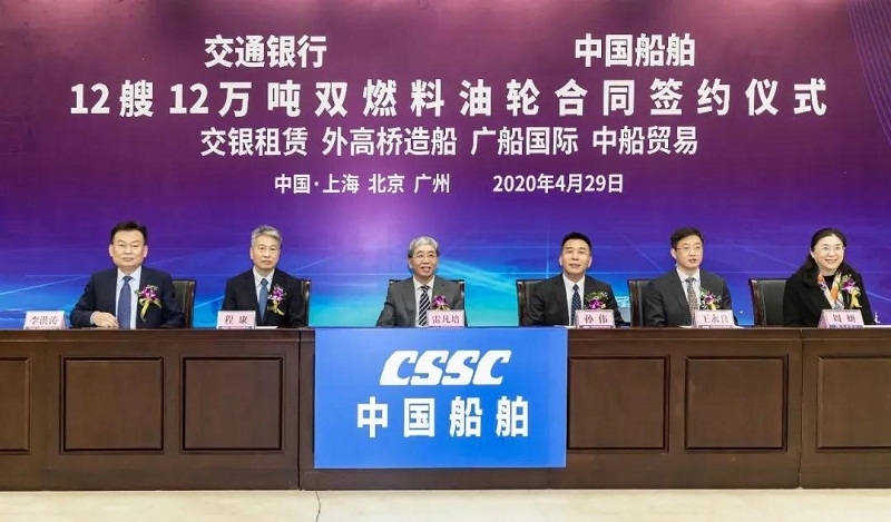 ????4月29日,中国船舶集团有限公司旗下中国船舶工业贸易有限公司、上海外高桥造船有限公司、广船国际有限公司与交通银行股份有限公司旗下交银金融租赁有限责任公司在北京、上海、广州三地以“云签约”方式签署12艘12万吨双燃料油船建造合同,合同总金额约46亿元人民币,这是中国船舶集团旗下单位近期承接的又一单笔大额订单。中国船舶集团党组书记、董事长雷凡培,交通银行党委书记、董事长任德奇,中国船舶集团党组成员、副总经理孙伟,交通银行党委委员、副行长吕家进出席签约仪式。