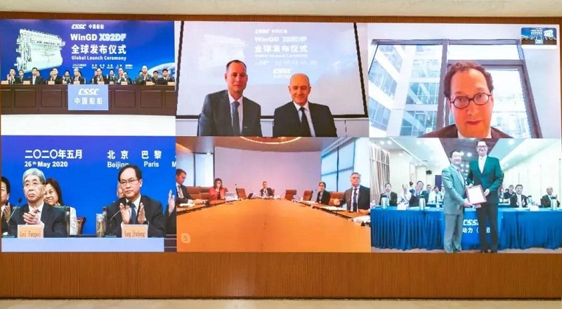 ????发布仪式采用视频形式,在中国北京、上海,法国巴黎、马赛和瑞士温特图尔全球五地远程连线同步举行。在各方嘉宾见证下,WinGD X92DF通过BV(法国船级社)型式认可,雷凡培宣布向全球发布。