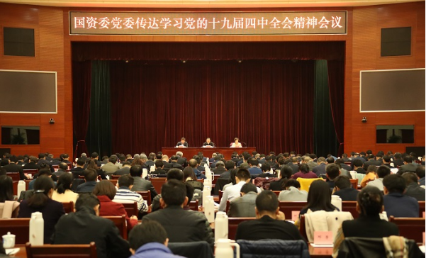????11月8日,国资委党委召开传达学习党的十九届四中全会精神会议,对国资委直属机关、中央企业和直管协会学习贯彻落实工作进行部署安排。国资委党委书记、主任郝鹏结合参加党的十九届四中全会现场聆听习近平总书记重要讲话的切身体会,结合国资国企实际作了宣讲,强调要深入学习贯彻党的十九届四中全会精神特别是习近平总书记在全会上的重要讲话精神,增强“四个意识”、坚定“四个自信”、做到“两个维护”,切实把思想和行动统一到全会精神上来,进一步完善国资国企制度体系,深化国资国企改革,增强国有经济竞争力、创新力、控制力、影响力、抗风险能力,做强做优做大国有资本,加快培育具有全球竞争力的世界一流企业,为实现“两个一百年”奋斗目标、实现中华民族伟大复兴的中国梦作出更大贡献。国资委副主任、党委委员赵爱明传达了全会公报和《中共中央关于坚持和完善中国特色社会主义制度、推进国家治理体系和治理能力现代化若干重大问题的决定》(以下简称《决定》)主要精神。国资委副主任、党委委员任洪斌主持会议。