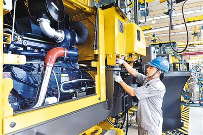 图为山东临工工程机械有限公司的工人在装载机生产线上作业。