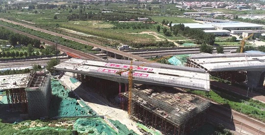 ????该工程上跨郑焦城际、京广铁路等3条线5股道,每天有140对高铁列车和货运列车擦肩而过,转体桥与铁路线的最近距离只有8.7米,加上该工程桥梁全长317米,宽38.7米,转体悬臂长71.75米,单侧转体桥梁重达3万吨,铁路东、西两侧转体桥梁总重达6万吨,体量大,风险高,施工难度可想而知。为确保总重量达6万吨的转体桥精准对接,重点在于球铰的制作、安装,转体过程中应力应变、位移与线性的实时监测。本次成功应用的转动体系采用钢球铰,由双瑞特装设计、制造、安装及转体施工,解决了大吨位桥梁转体装置超大承载力,灵活转动的难题。