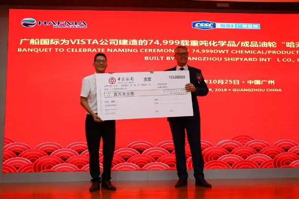 10月25日,广船国际有限公司为VISTA公司建造的7.5万吨化学品/成品油船4号船命名交付。这是广船国际在“决战120天,掀起生产高潮”劳动竞赛中收获的又一枚胜利果实。该船比合同交船期提前43天交付,船东为此专门奖励广船国际1万美元。