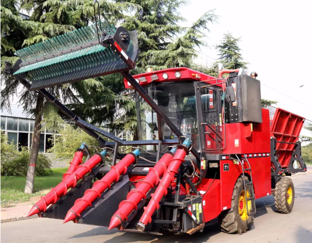 该大型农机设备,可收割田地坡度小于5°,种植垄距1. 1~1.2米的甘蔗,能同时完成甘蔗的扶正、分蔗、切梢、跟切、喂入、输送、除杂和集料转运等作业,不需要辅助工具,一次收割两行,收割效率高。采用整杆式收割模式,有效解决了切断式甘蔗存储时间短的问题。独特的切刀智能仿形系统,使甘蔗跟切喂入更顺畅,减小蔗径损失率,且宿根切口平整,保证甘蔗来年发芽率。