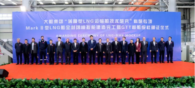 ????2019年11月26日,大船集团举行“薄膜型LNG运输船技术研究”科研专项MarkⅢ型LNG船全封闭模拟舱建造完工暨GTT和船级社颁证仪式。法国GTT公司、英国劳式船级社和中国船级社代表在模拟舱建造现场向大船集团代表颁发证书。