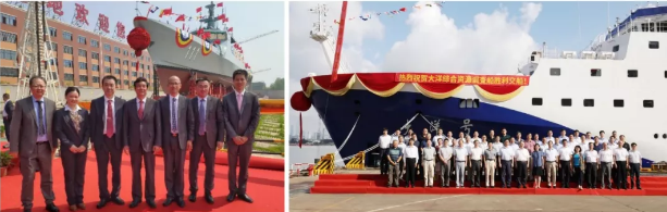 以上左图:马来西亚濒海任务舰首舰“KERIS”号下水;右图:“大洋号”综合资源调查船交船仪式。