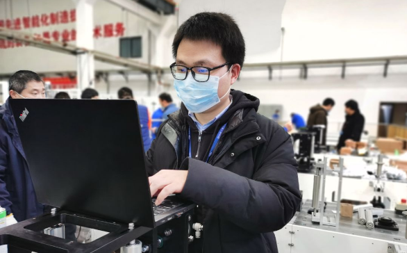 ????徐存培是平面口罩机项目的技术负责人。自接到平面口罩机研制任务以来,他几乎就“长”在公司里了。他穿梭在各台平面口罩机间,一会儿垫脚测量放料架距离地面的高度,一会儿弯腰拧紧设备柜里的螺丝,一会儿又紧盯着传送带,看无纺布贴合的角度是否精准无误……
