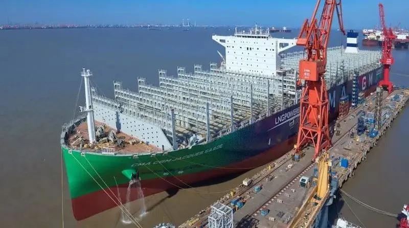 ????3月16日,中国船舶集团所属沪东中华建造的全球首艘23000箱液化天然气(LNG)动力集装箱船开启了常规试航之旅。该超大型LNG动力集装箱船总长400米,型宽61.3米,服务航速22节,载重量近22万吨,被业界形容为“绿巨人”;采用了一颗独一无二的“绿色心脏”——一个18600立方米的MK Ⅲ薄膜式燃料舱,能满足全球最严格排放要求。