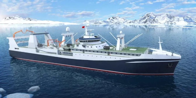 由七〇一所武船院设计的该系列南极磷虾捕捞加工船排水量近2万吨,采用先进的连续捕捞系统及现代化生产流水线,是我国目前已启动最大最先进的南极磷虾捕捞加工船,建成后将填补我国在南极磷虾高端渔船设计领域的空白,为我国开发南极磷虾产品提供装备保障。