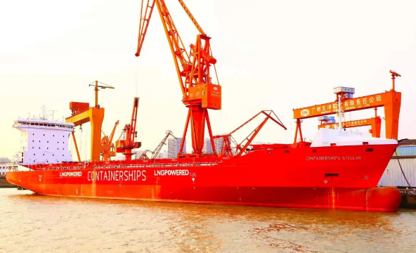 5月12日,黄埔文冲为法国达飞轮船集团建造的1400TEU双燃料集装箱“CONTAINERSHIPS STELLAR”号交付。