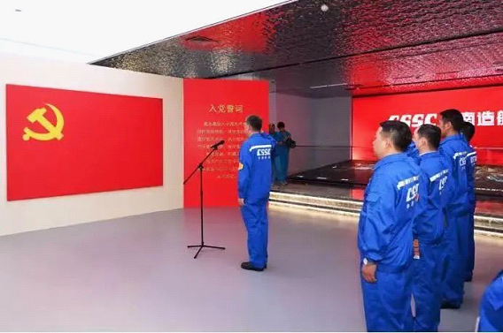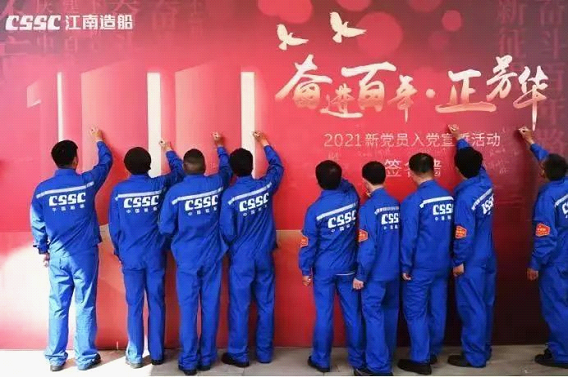 在庆祝中国共产党成立100周年之际,100名来自中国船舶集团的产业工人新党员在江南造船博物馆集中进行了入党宣誓。