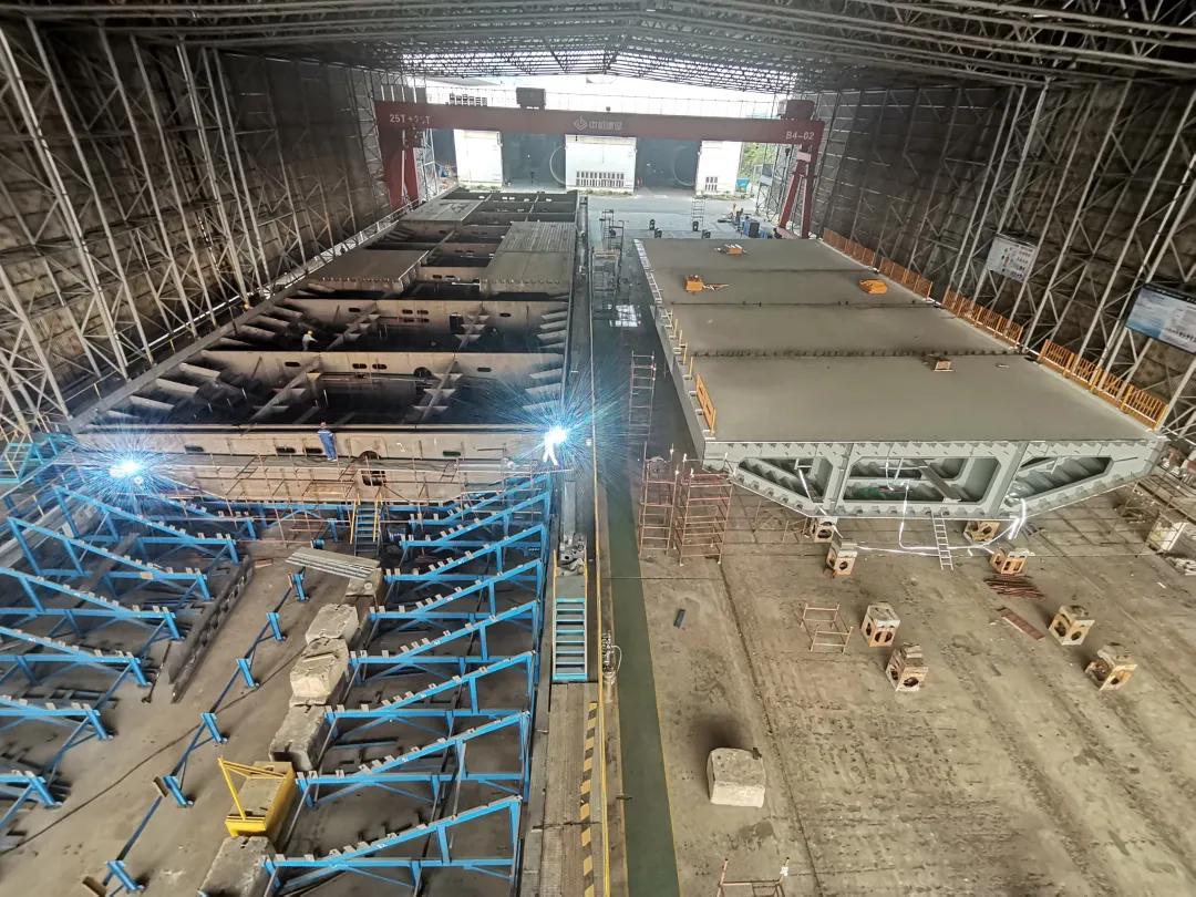 同样承担了深中通道隧道沉管钢壳制造任务的中国船舶集团旗下广船国际,近日刚刚完成了E15管节钢壳的过驳交付。E16钢壳计划在9月底前进行联合验收;E17钢壳则正在进行大节段总组。