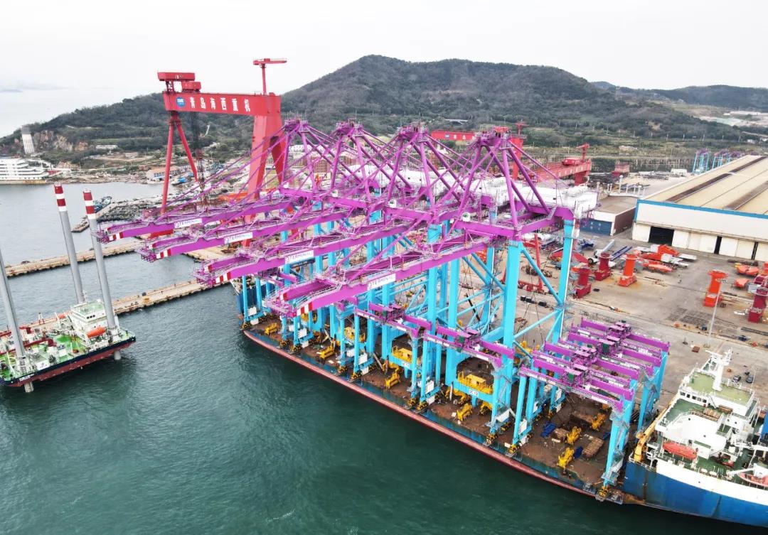 近日,武汉船机海西重机为卡塔尔哈马德新港二期打造的4台岸桥、10台轮胎起重机从青岛西海岸新区启运。