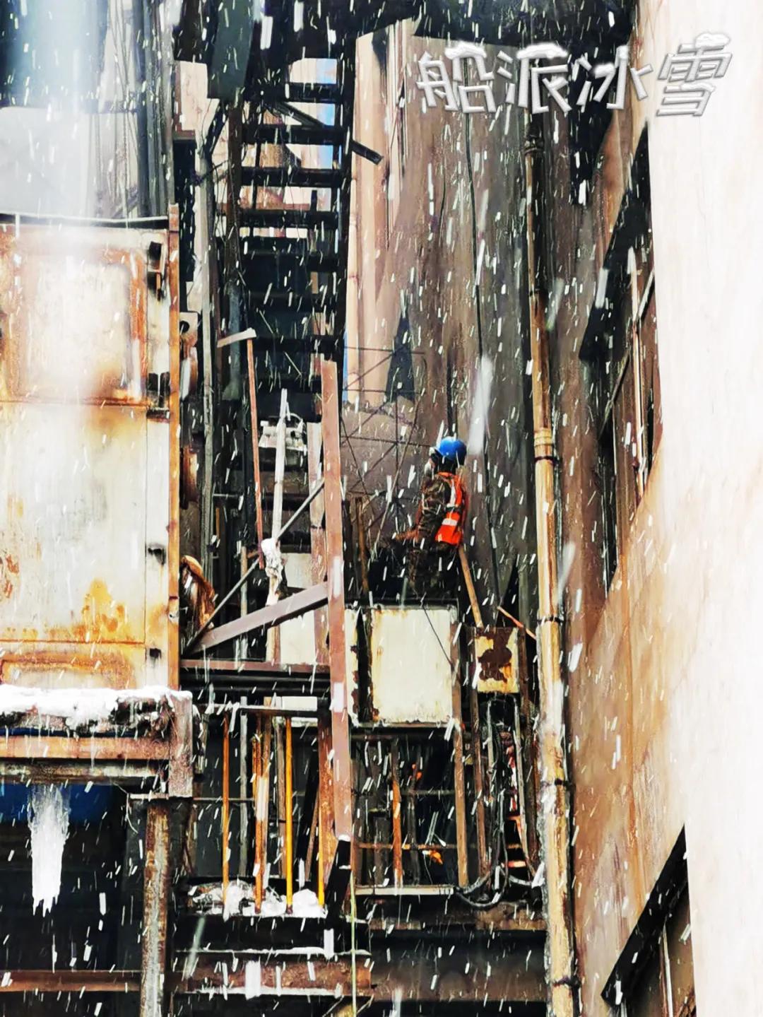 过膝的大雪掩埋了吊车的轨道,渤船小伙抄起“家伙”,为吊车开道,胳膊抡圆,雪花纷飞,别说这画面还真有点浪漫了。