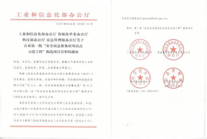 近日,工业和信息化部办公厅、发展和改革委员会办公厅、科学技术部办公厅、应急管理部办公厅联合公布首批“安全应急装备应用试点示范工程”候选项目。