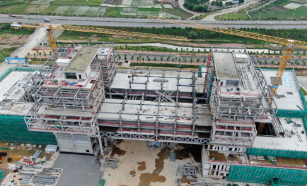 101#总部研发大楼是湛江湾实验室一期项目的核心工程,其上部重达1.8万吨的主体结构由53.4米跨度的转换桁架承托。该转换桁架是世界现有的第二大跨度转换结构,同时与转换桁架两端相连的双层钢板剪力墙核心筒也是实现该建筑结构设计的关键部位。