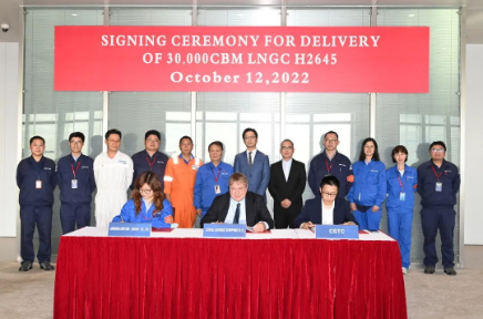 10月12日,中国船舶集团旗下江南造船为荷兰船东Anthony Veder公司设计、建造的30000立方米液化天然气(LNG)运输船“Coral Nordic”号在上海签字交付。