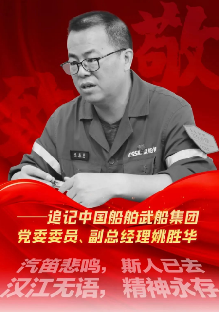 汽笛悲鸣,斯人已去;汉江无语,精神永存。中国船舶集团有限公司旗下武昌船舶重工集团有限公司党委委员、副总经理姚胜华,一位沉默、讷言的人,他把自己熬干了、燃尽了,默默地用理想和信念、用忠诚和热血、用苦干与实干铸就的,是一座伟大的丰碑!他的精神就像一面高高飘扬的旗帜,跨越时空,熠熠生辉!