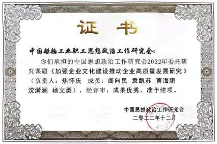 近日,由中国船舶工业职工思想政治工作研究会申报的中国思想政治工作研究会2022年委托课题《加强企业文化建设,推动企业高质量发展研究》评审结果公布,成果优秀,报经中央宣传部领导审定准予结项。这是中国船舶政研会首次承担中国政研会委托课题并获评优秀。