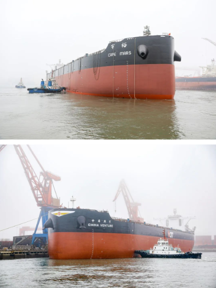 1月12日,中国船舶集团旗下北海造船2号坞21万吨16号、23号散货船出坞,顺利实现大节点计划,迎来2023年开门红。