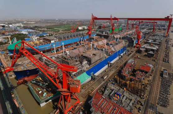 近日,在中船长兴造船基地中国船舶集团旗下沪东中华2号船坞,首次呈现了4艘174000立方米大型液化天然气(LNG)运输船同坞建造,其中2艘同日出坞、2艘半船起浮的盛景。