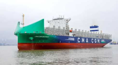 5月23日,由中国船舶集团旗下沪东中华联合中船贸易为法国达飞集团建造的13000TEU液化天然气(LNG)双燃料动力集装箱船系列4号船“CMA CGM SAOPAULO”号,在沪东中华长兴岛厂区命名交付。南美洲东海岸航线又将新添一艘中国“智”造的新一代绿色环保、高效节能型集装箱船,为达飞集团箱船船队绿色转型发展贡献新的中国船舶动能。