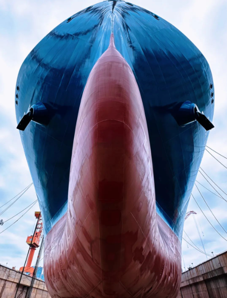 # 通过采用新型双艉鳍线型,配备空气润滑系统,进一步提升了水动力性能,增强了推进系统安全冗余;