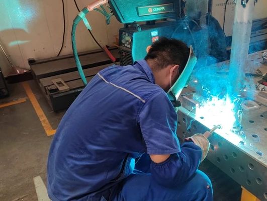 武汉船机——钢构制造部员工穿着厚厚的防护服进行焊接工作。